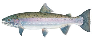 This Limited Edition Print is signed and numbered by the artist. Joe Tomelleri is considered by many to be the finest illustrator of fish in the world today. Accurate in every detail, Joe captures the subtle color variations and iridescence that give his illustrations a truly life-like quality. Each Limited Edition print shows collection locality for specimen and scripted common and scientific names. This drawing features the North Umpqua Summer Stelhead. 14 x 25"