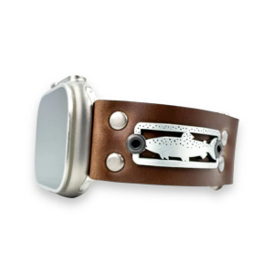 Add some style to your Apple Watch with our badged watch bands. A diecast badge by artist Edgar Diaz is mounted on our soft horween leather band and attached to apple watch band connectors. Textured Tectonic diecast skinny badge mounted on 1" leather watch band. Attach to your Apple Watch with a new and improved one piece metal strap connector. Fastened with 'just right' adjustable sizing closure 7" up to 8" wrist. Apple Watch is not included. We hope this watch band provides you with a tangible reminder of the beauty and enjoyment of time spent fishing for trout, camping under the stars.