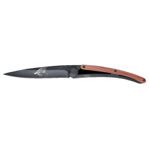 The coral wood that adorns the handle of this Deejo knife is a true ode to deep blacks. This exceptional wood species has the particularity of being practically impervious to ambient humidity. It thus becomes the densest, most resilient and most precious wood, ideal for this magnificent piece of cutlery. Obtained by fixing grey titanium onto a stainless steel base, this finish has a double advantage. First, it reinforces surface resistance to shocks and scratches, and second, it renders sublime the pure lines of your knife displaying a temperance pushed to its peak. A discreet finish par excellence, the steel acquires a slight patina over the years to further enhance this beautiful piece of cutlery.