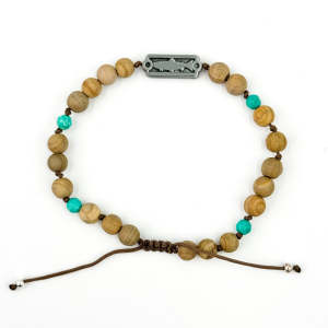 The SLP bead is our latest design that gives you one more way to stack your pursuits. Our Trout bead sits at the center with the accent of sandalwood stone beads and natural turquoise. The bracelet closes with a moveable pulley closure to allow for a broad range in wrist size. Metal trout bead on brown 1mm thread with 6mm sandalwood colored stone beads and real turquiose 4mm faceted beads. Moveable pulley closure opens to 10.5" and closes to 6" wrist size.